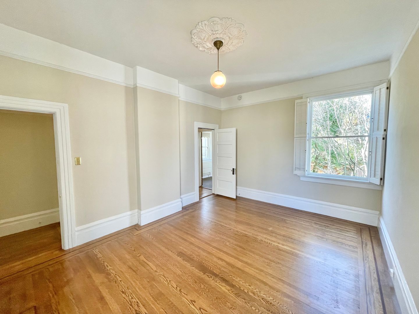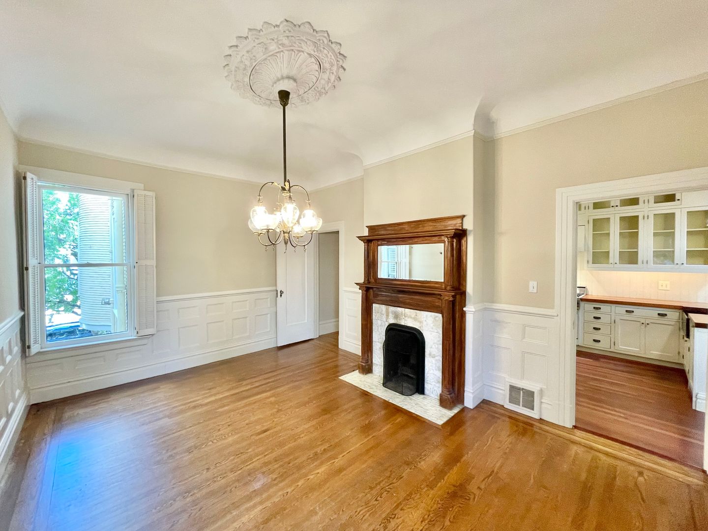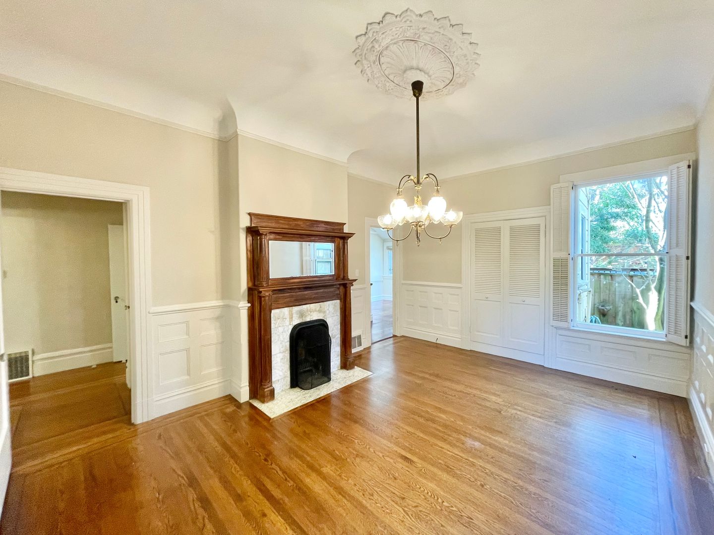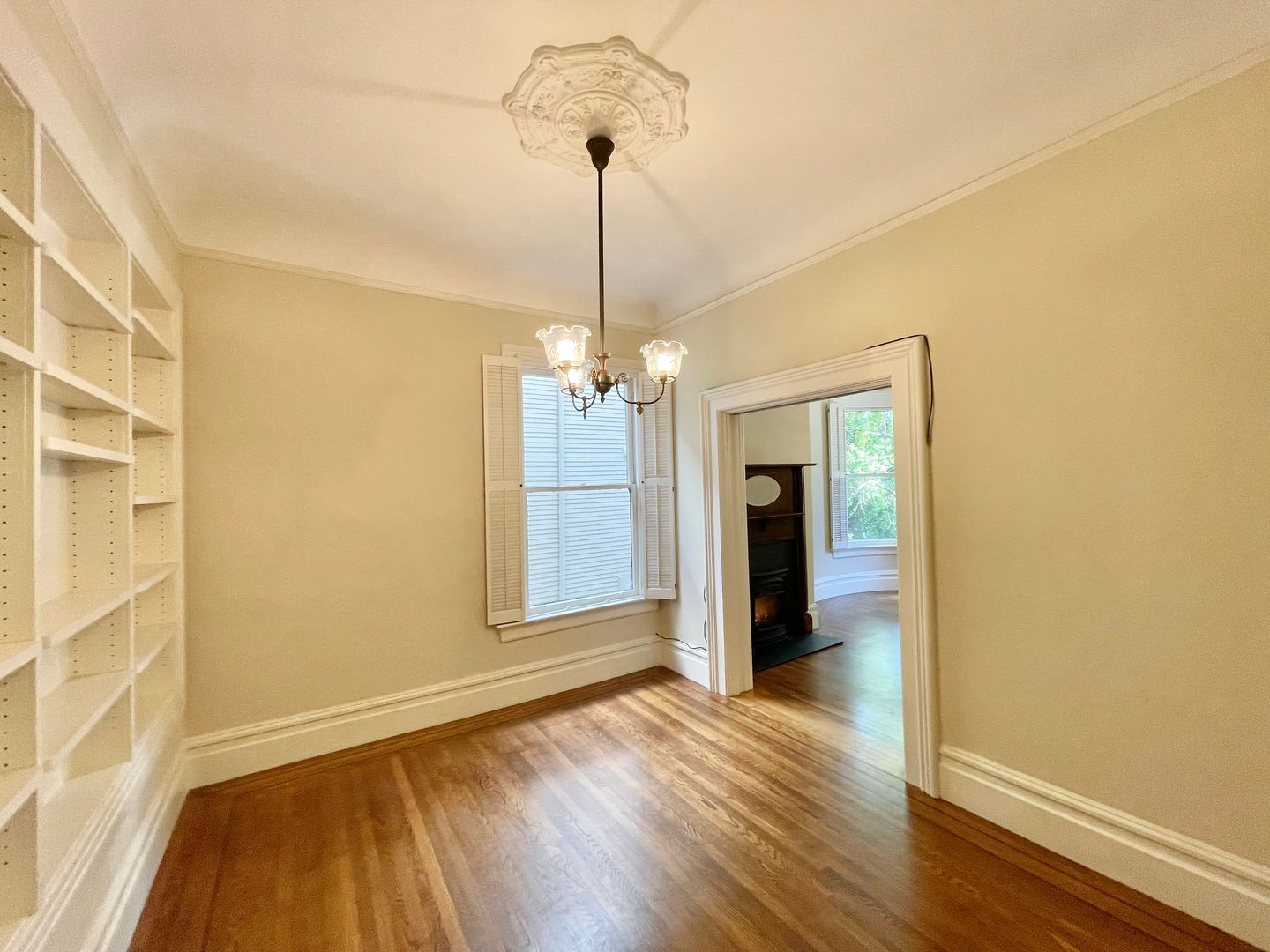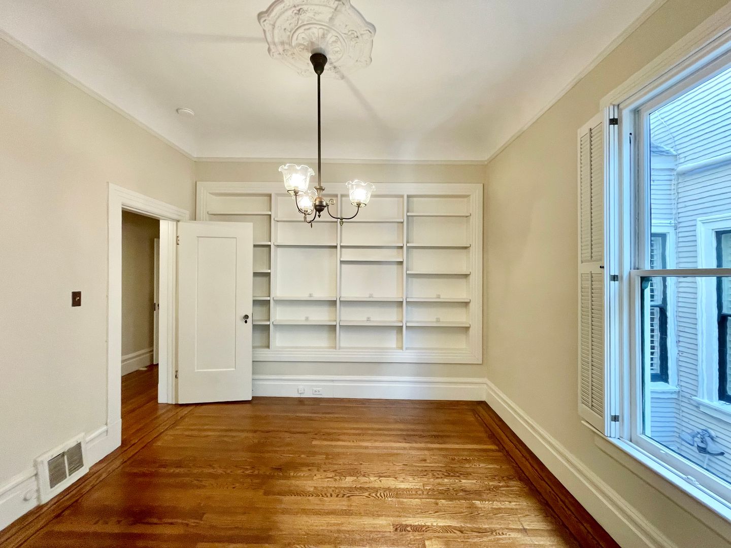 The double living room contains a large bay window and an entire wall of built-in bookcases. Beautiful hardwood floors and delightful molding everywhere!
