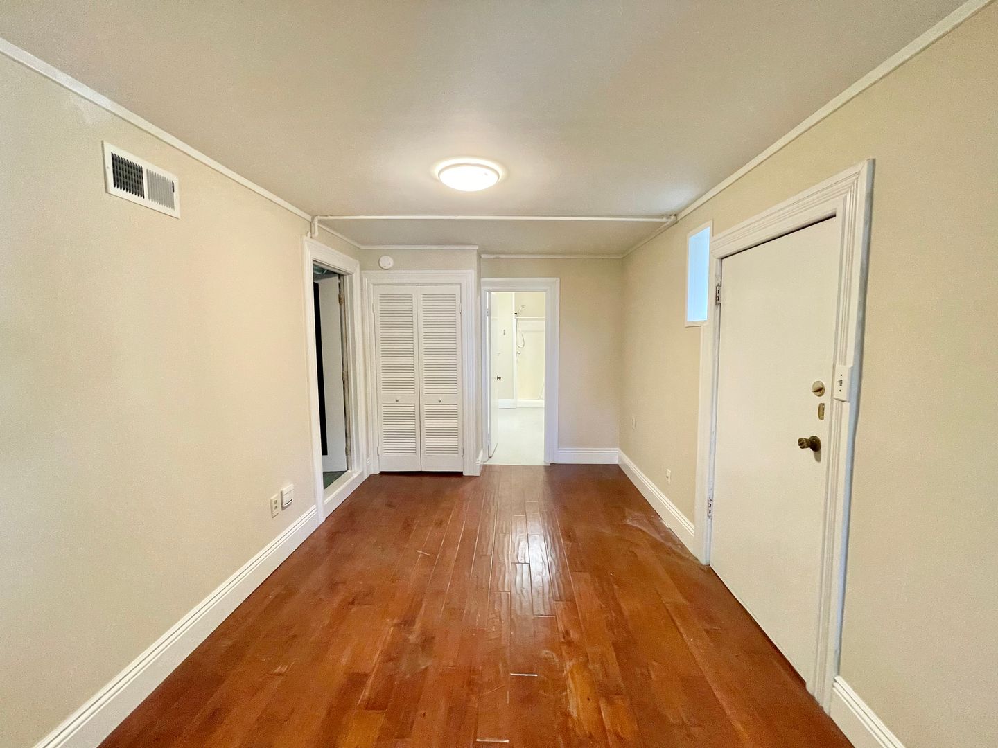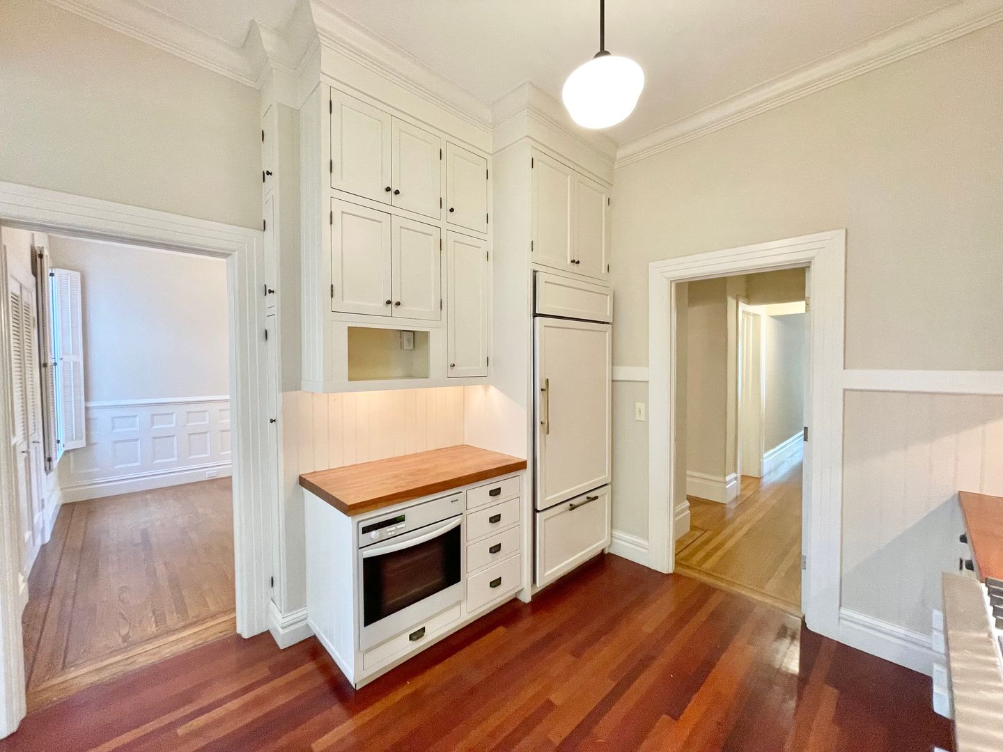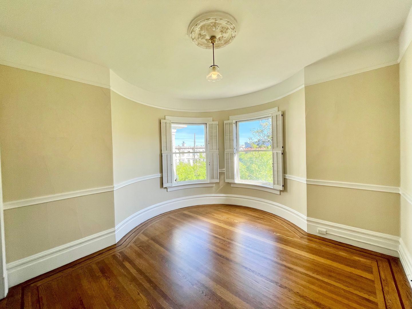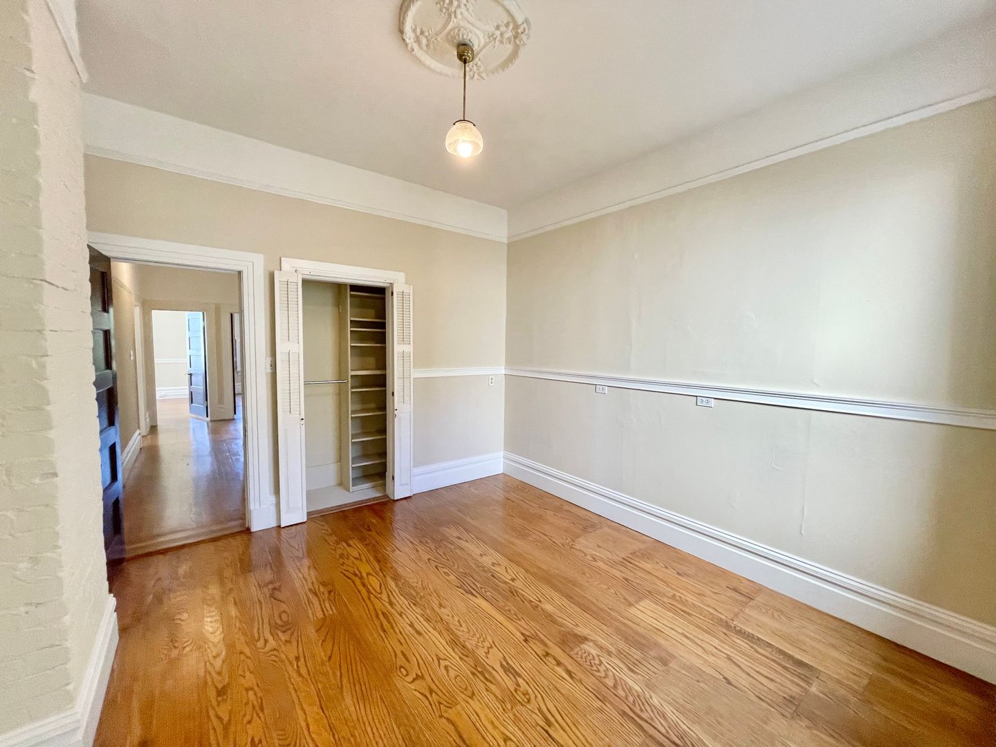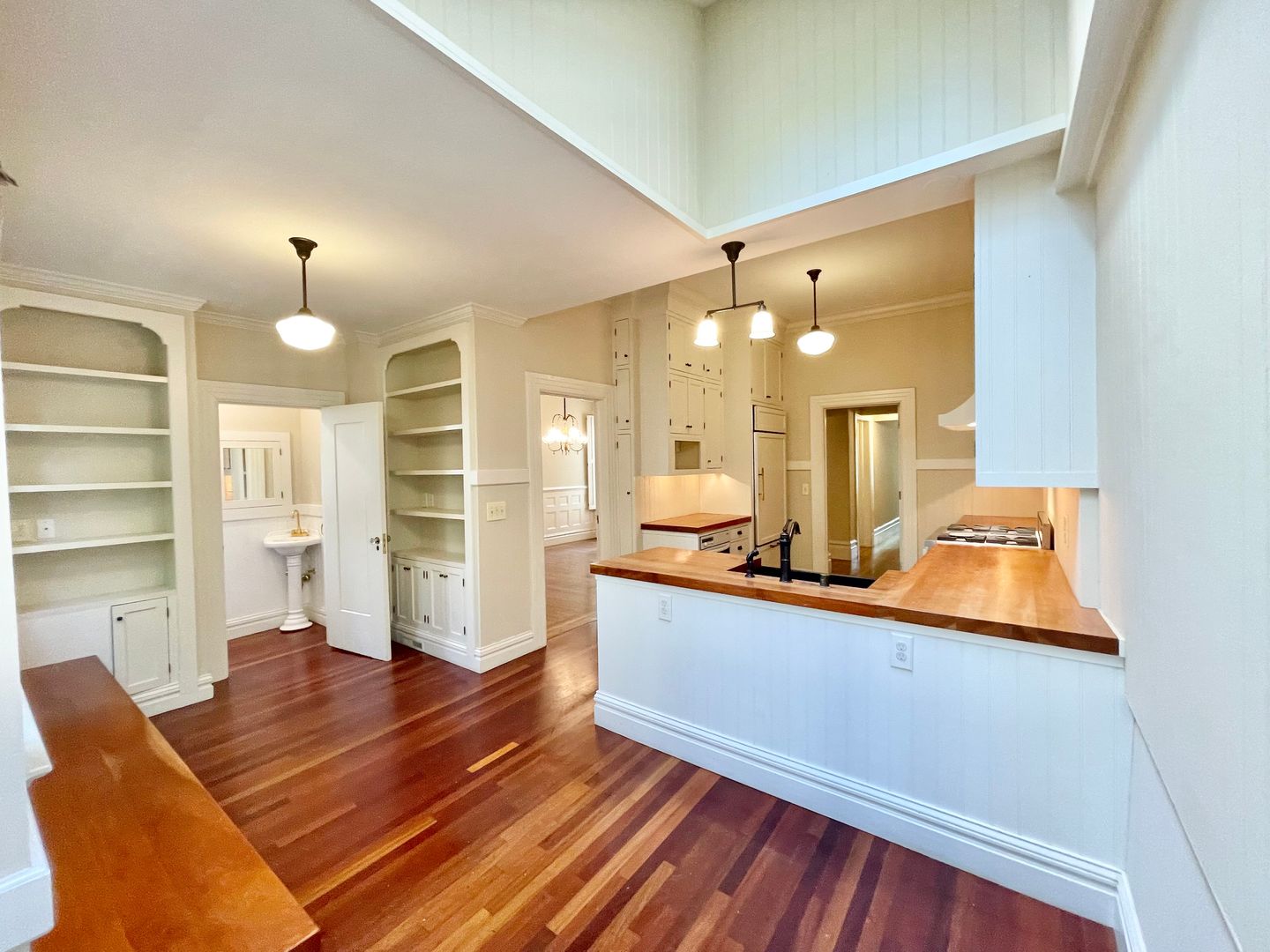 The double living room contains a large bay window and an entire wall of built-in bookcases. Beautiful hardwood floors and delightful molding everywhere!