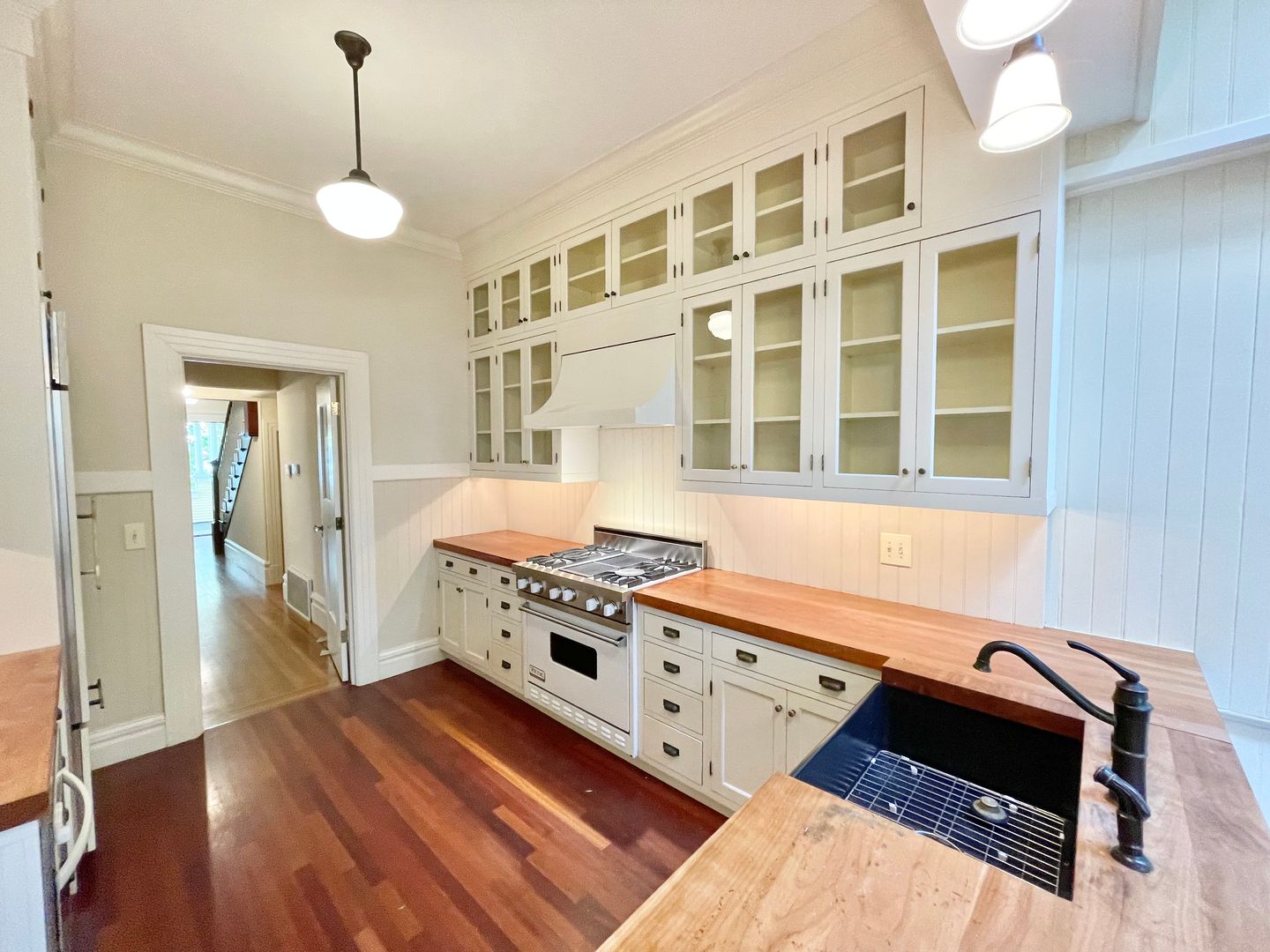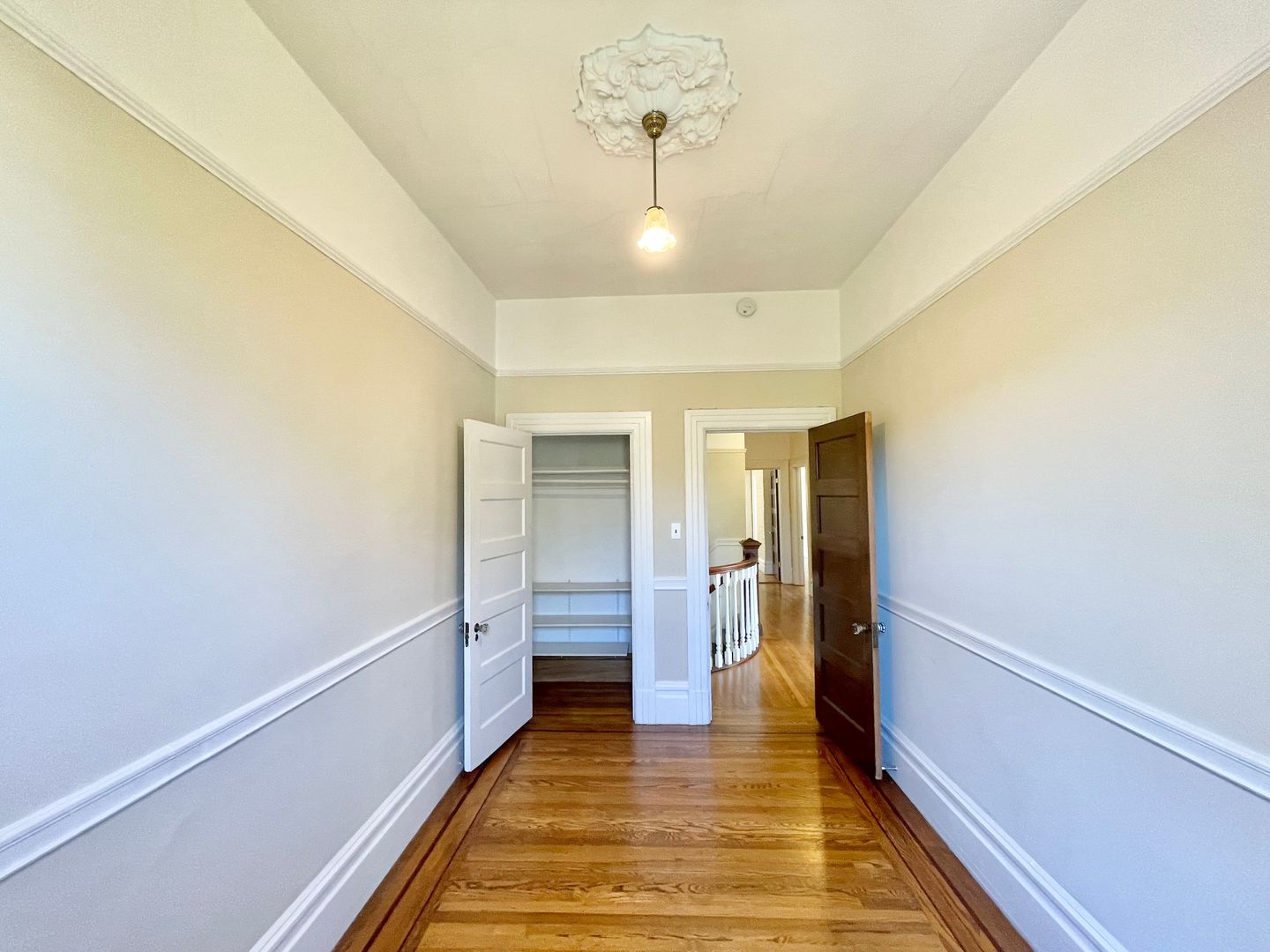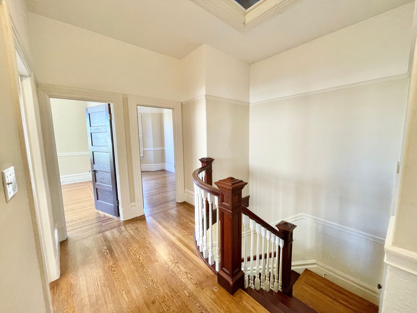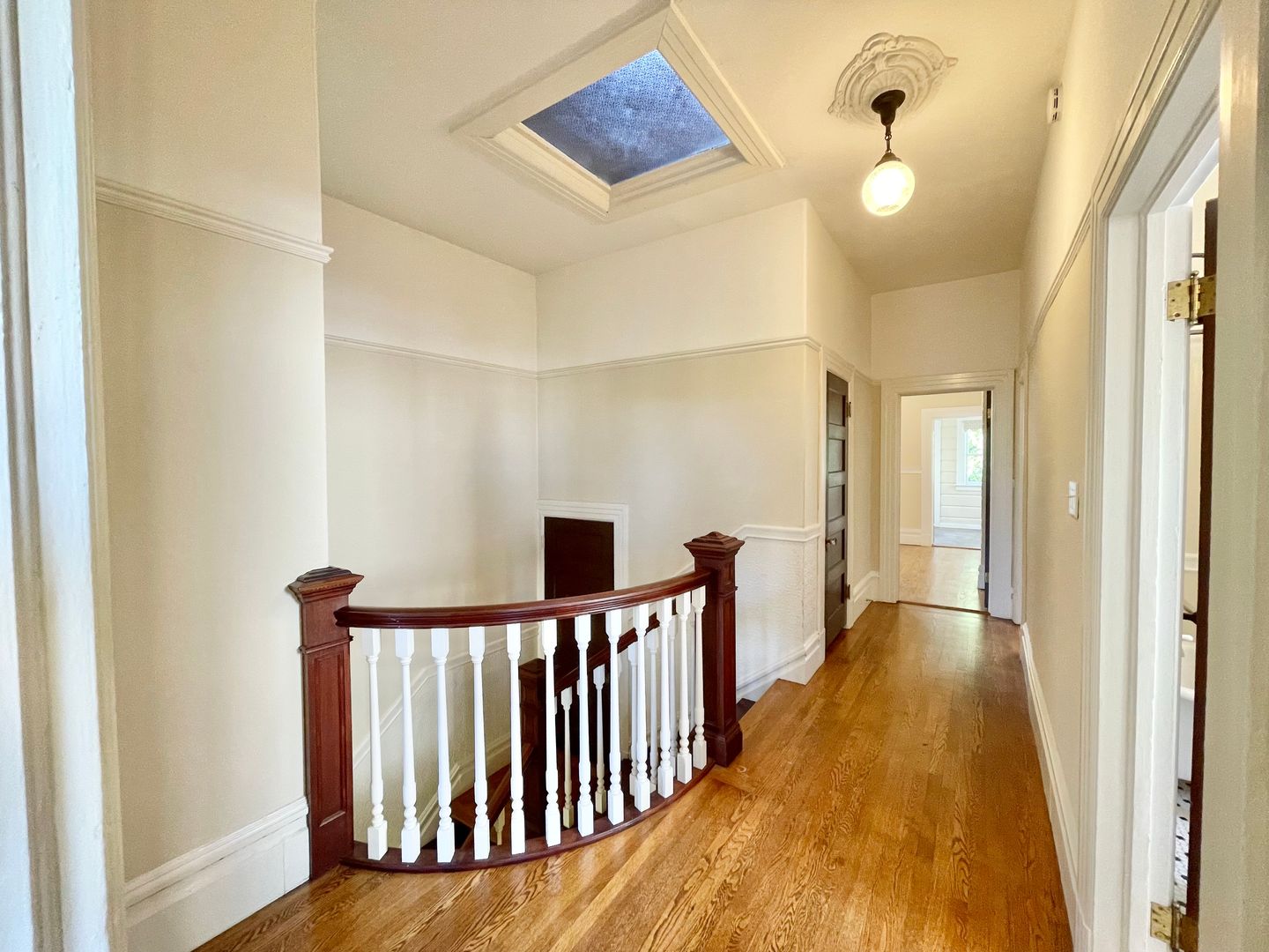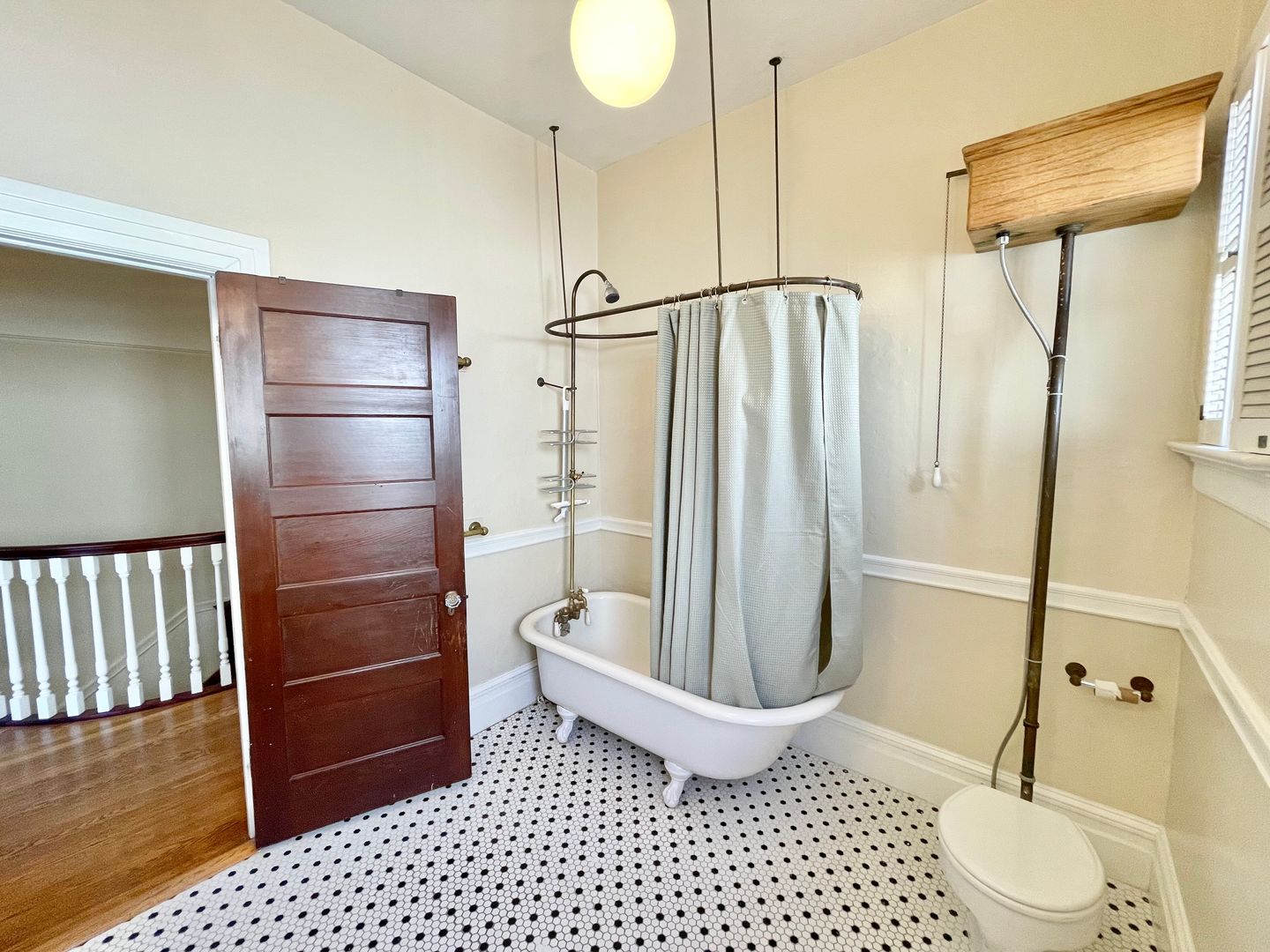 An elegant winding staircase leads to the top floor landing which leads to 4 bedrooms with high ceilings, beautiful molding, and lovely tree-top outlooks. A spacious full bathroom has pedestal sink and large claw foot tub with shower.