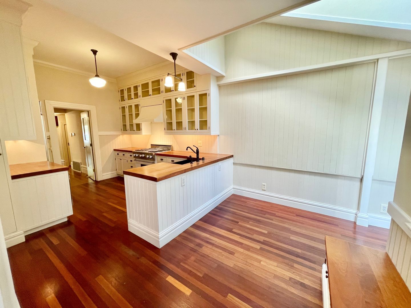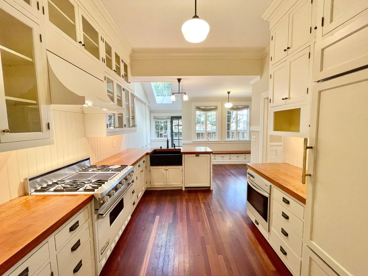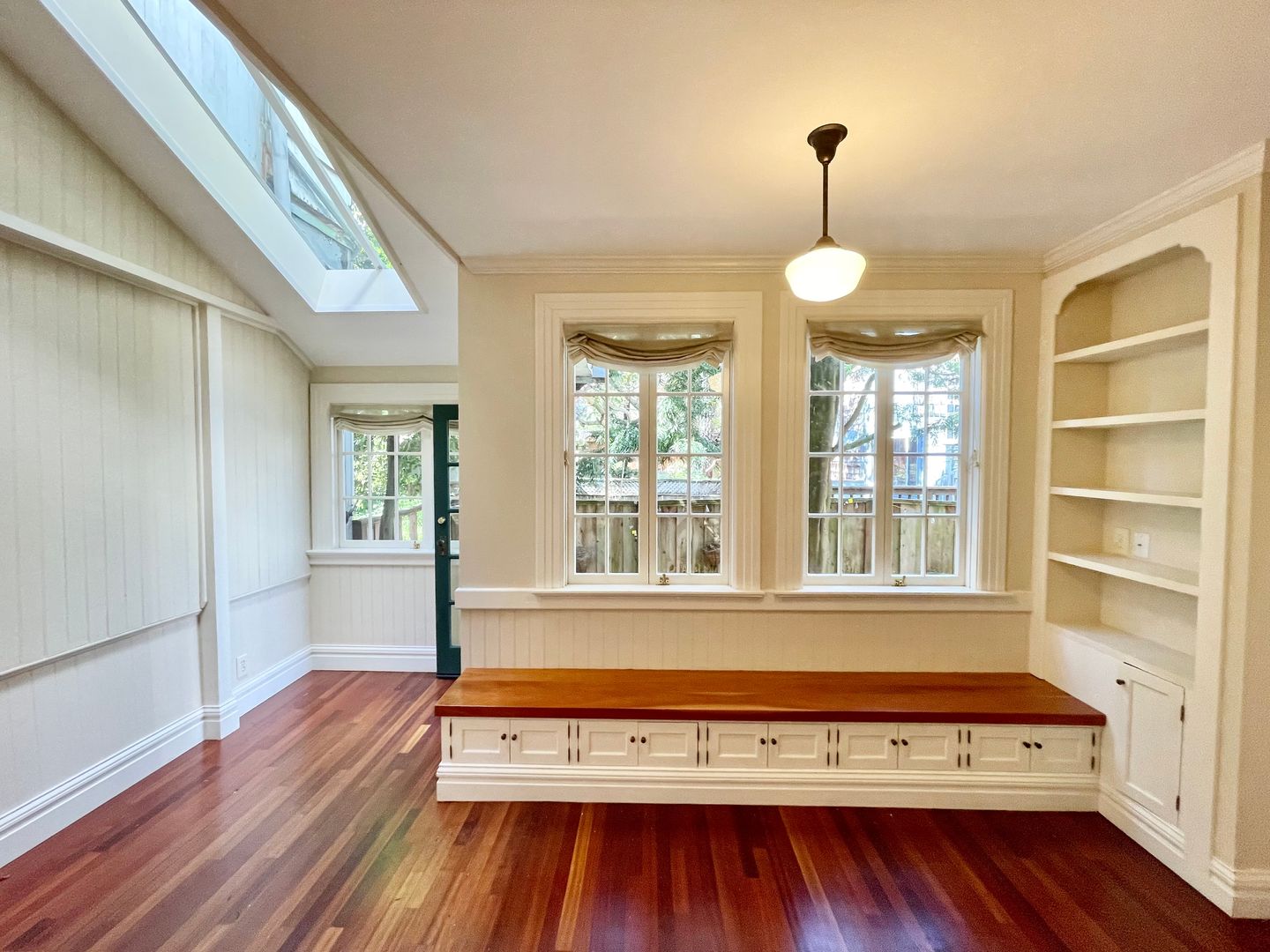 The kitchen is truly a chef’s delight with Subzero refrigerator, Bosch dishwasher, Miele convection oven, and custom cabinetry. Adjacent is a large eat-in area with a built in banquet that will comfortably seat 8 for less formal meals. Skylights bathe the room with sunshine and there is a half bathroom.