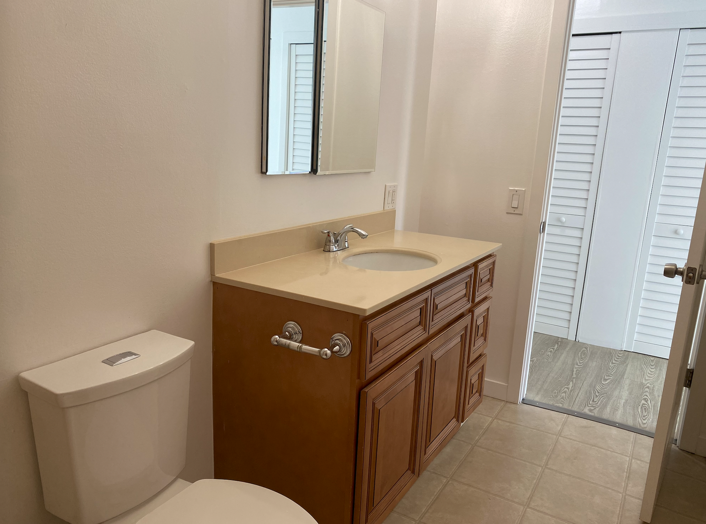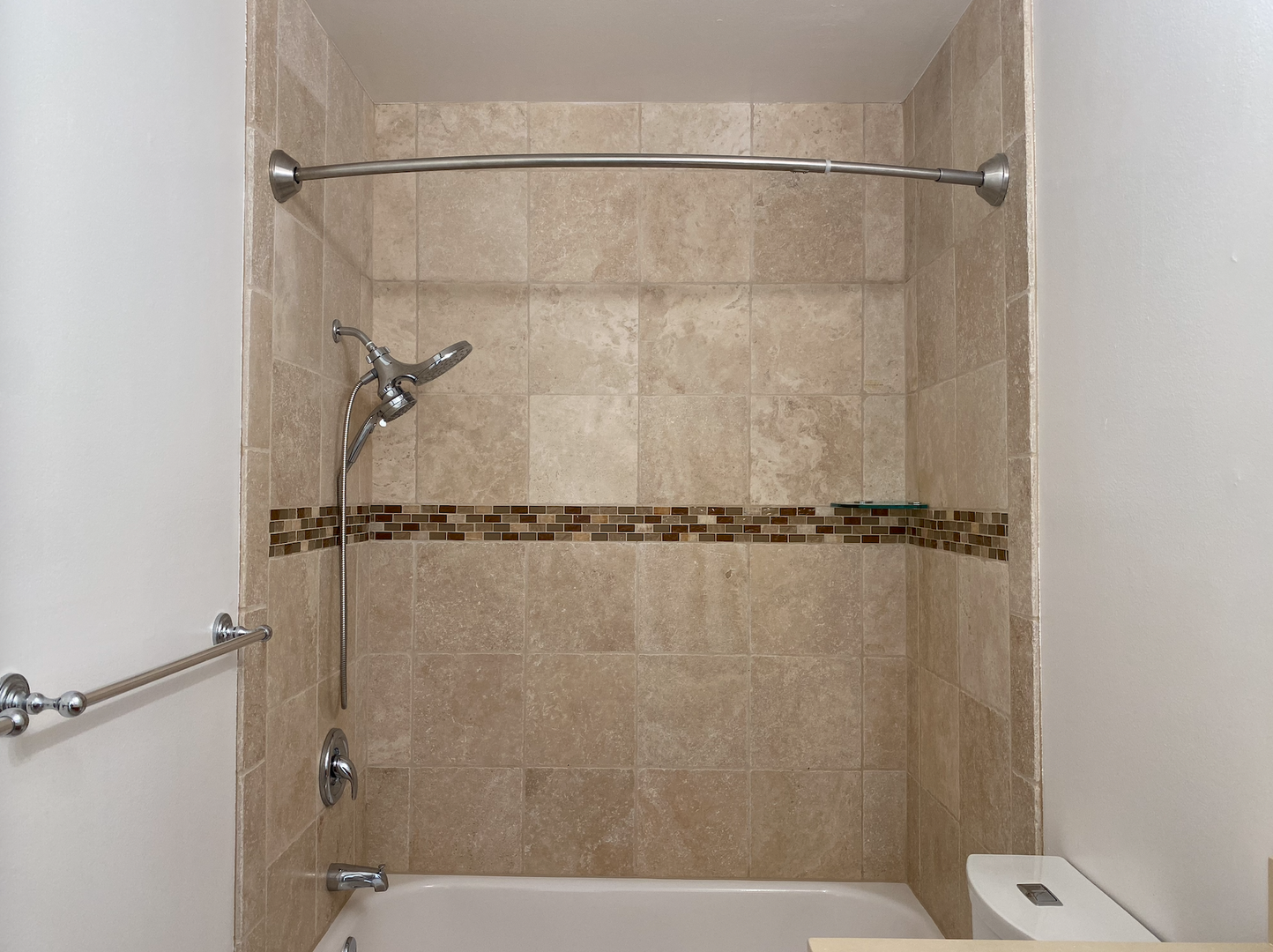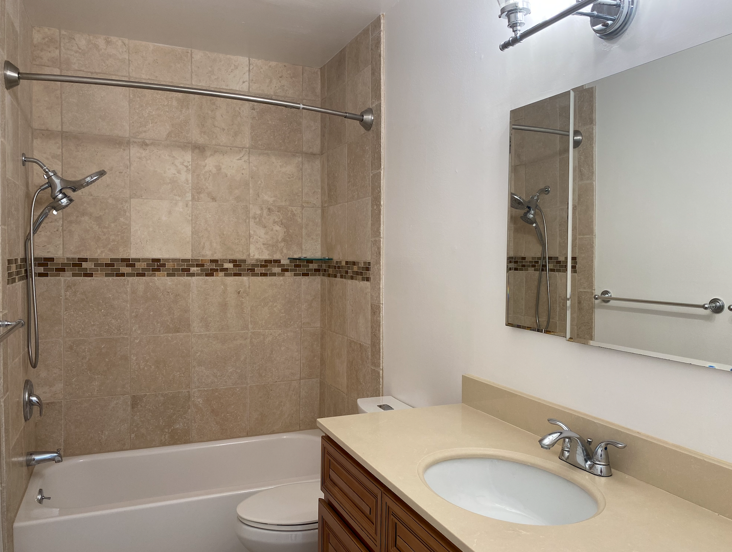 - Recently remodeled bathroom with shower, tub and tile surround, quartz counter top on vanity.