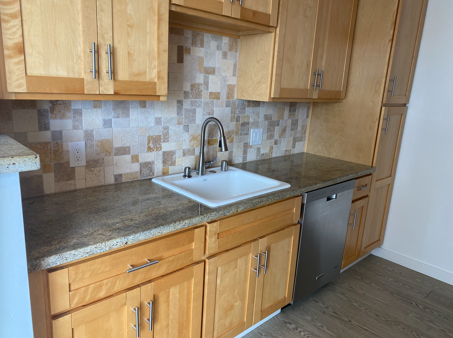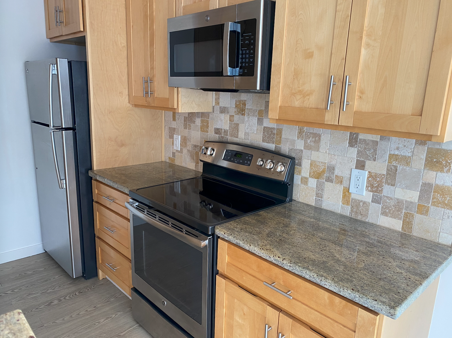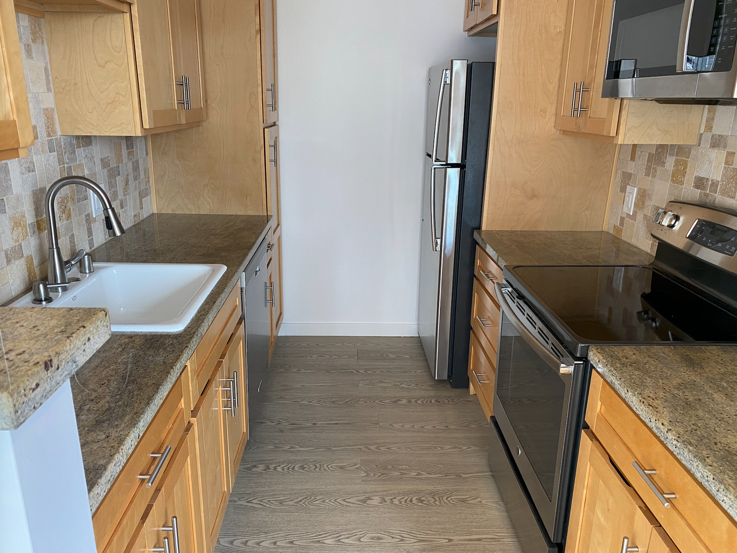 - Luxury kitchen finish includes granite countertops, professional stainless steel appliances, dishwasher, stove and tile floor.