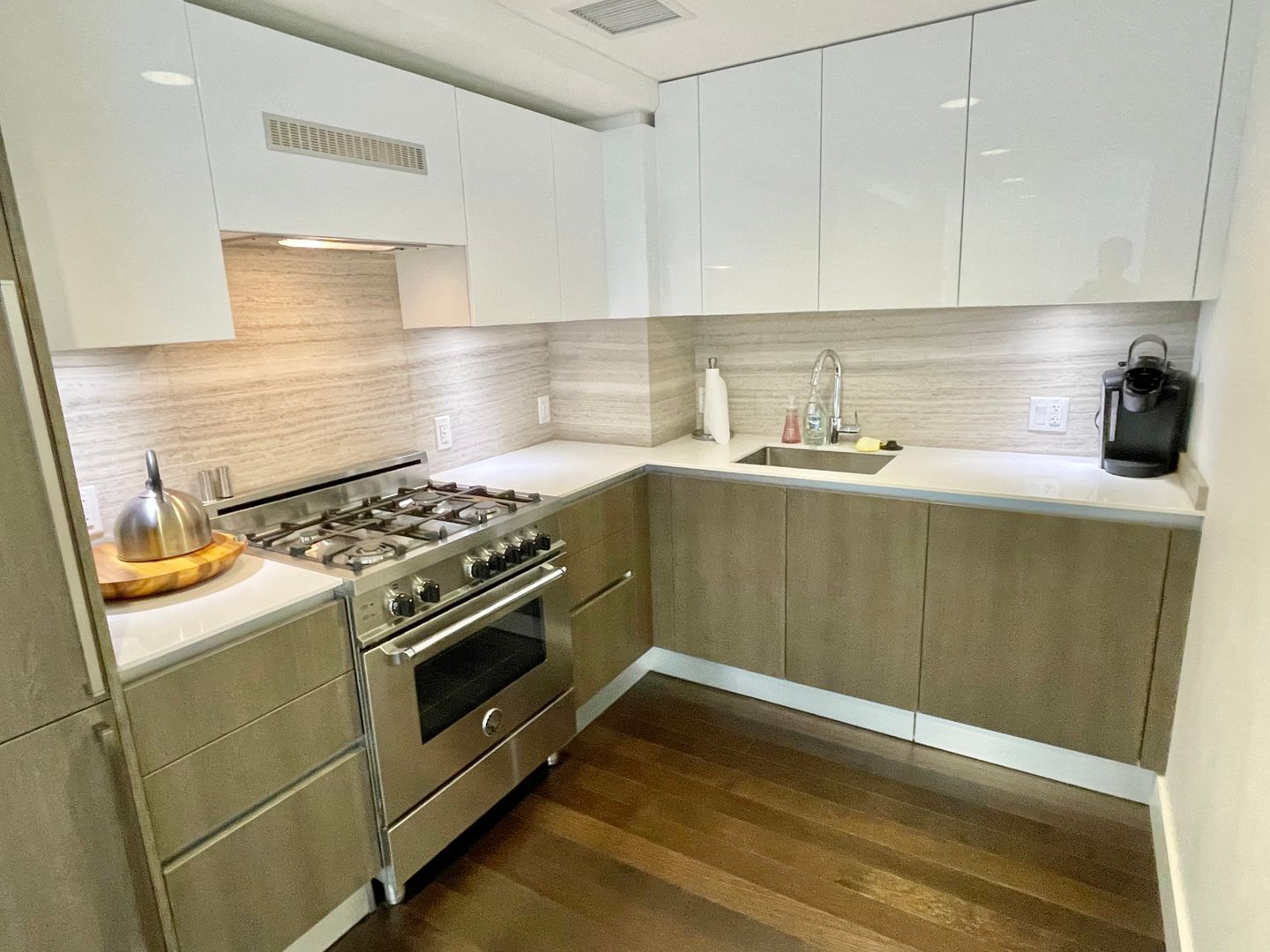 A contemporary kitchen with high-end appliances including stainless gas stove, hood, refrigerator and dishwasher. Ample cabinet and counter space.