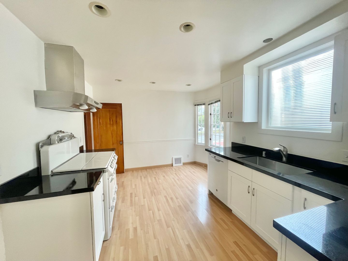 The remodeled kitchen is extra spacious with room for a breakfast nook, cabinet and counter space, and appliances, including a stove, range, refrigerator, and dishwasher.