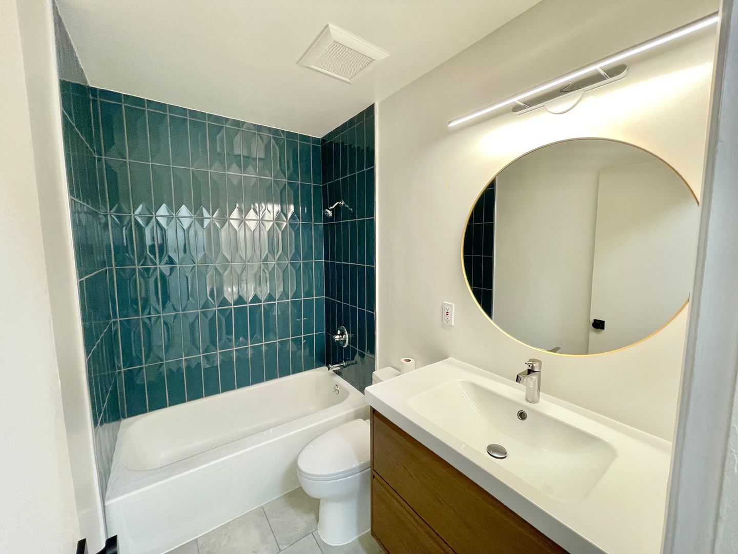 - Remodeled bathroom with modern finishes and bathtub/shower combination