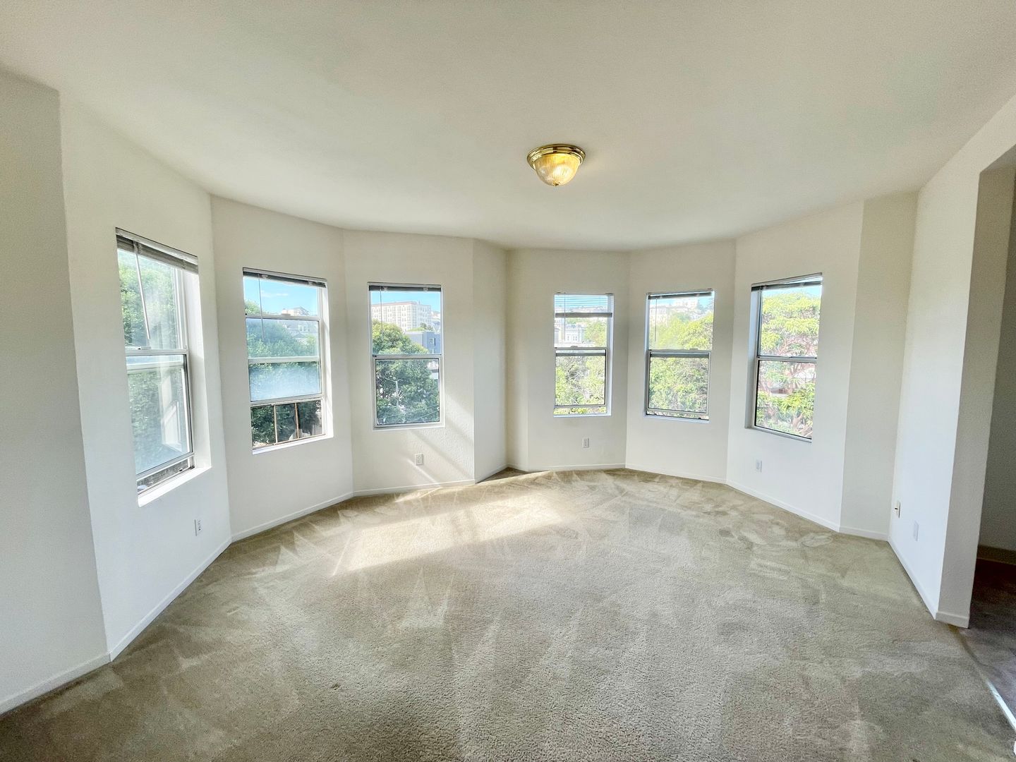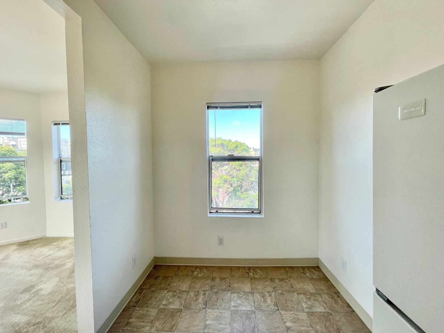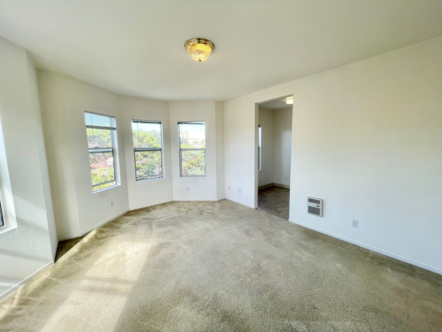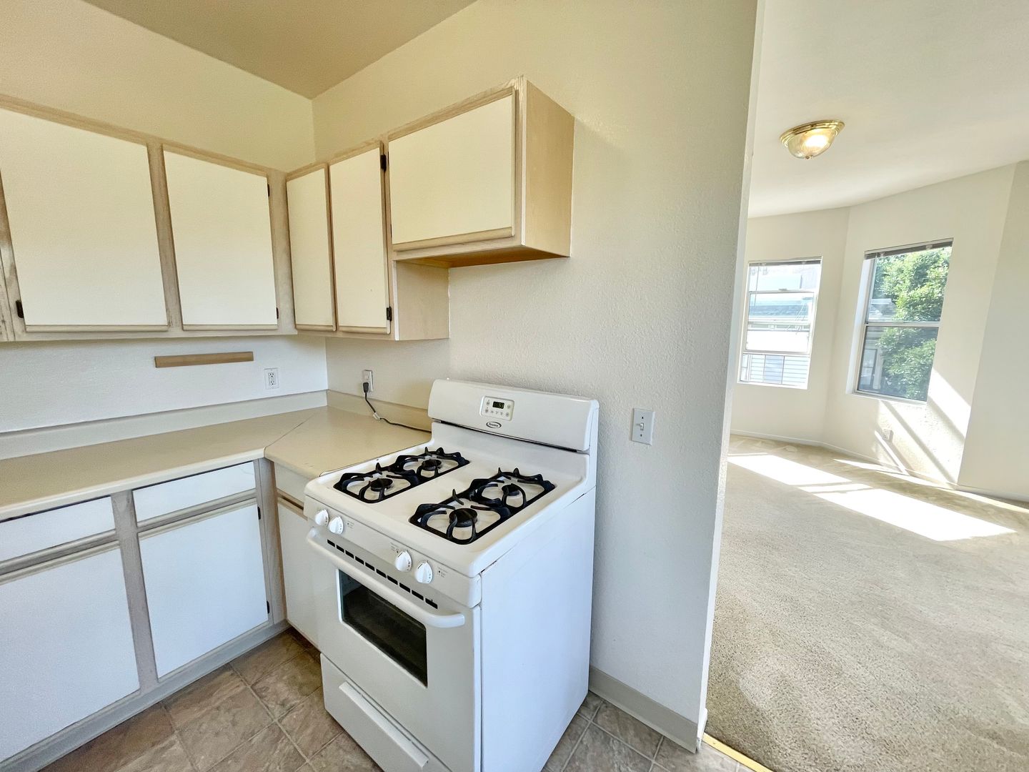 The living area has large bay windows that provide vibrant neighborhood views. Enjoy plenty of natural daylight with high ceilings that give a very spacious feeling. Enjoy a huge walk-in closet, a full-size bath featuring a tub over shower combo, and bright and sunny living spaces. This apartment is carpeted throughout. It features a nice sized kitchen with an eat-in area, gas range, plenty of counter space, and ample storage, along with bike parking in the garage.