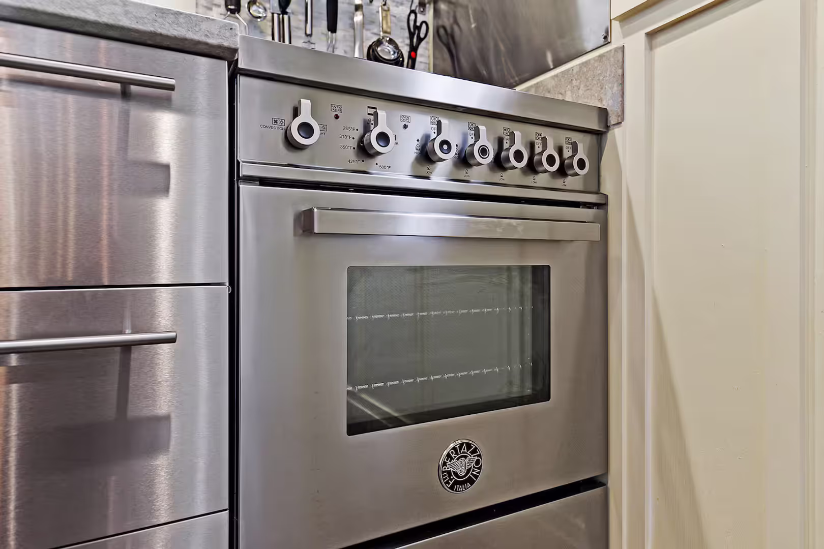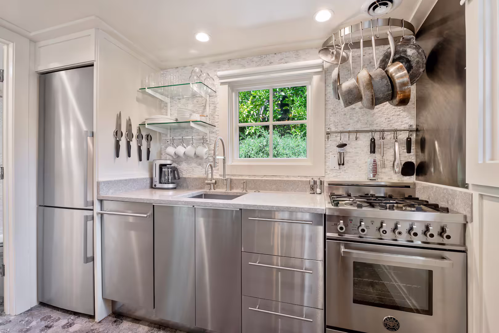 Chef’s kitchen is equipped with Bertazzoni gas range, stainless refrigerator and dishwasher.