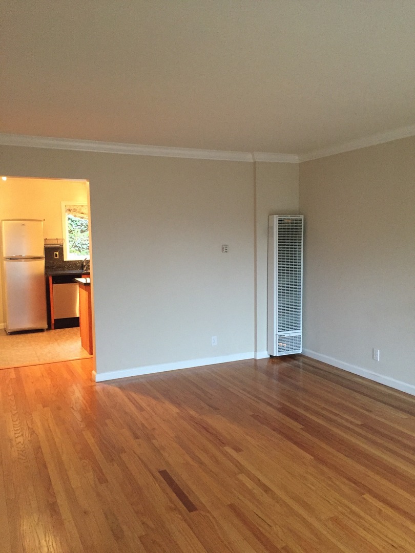 - Wood floor in living room and bedrooms; tile in bathroom and kitchen area