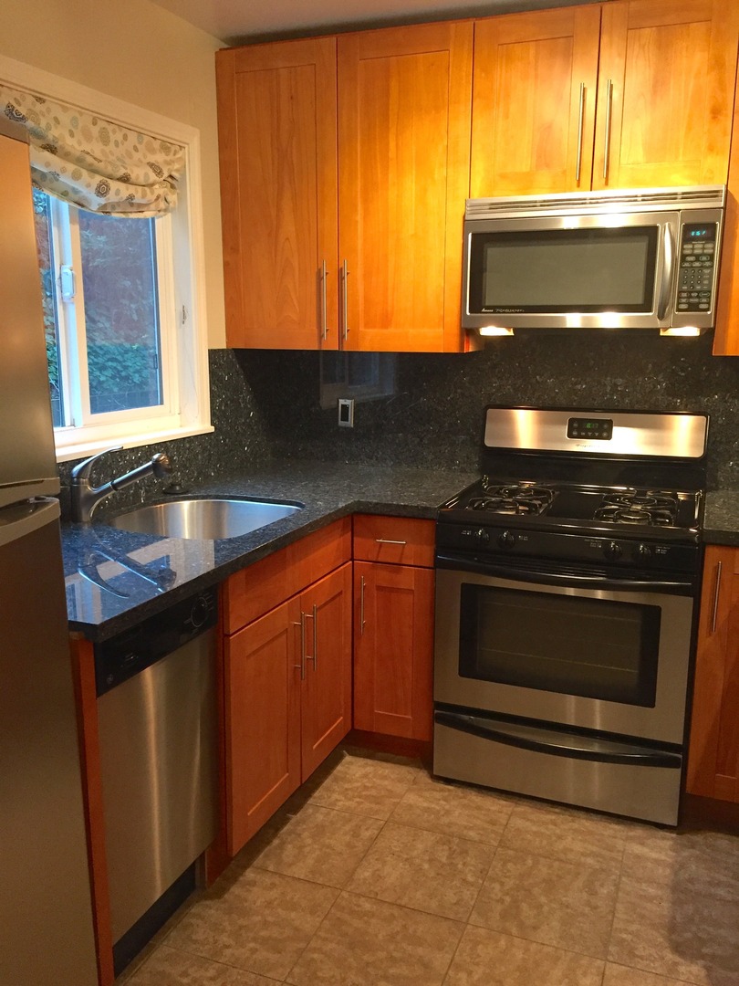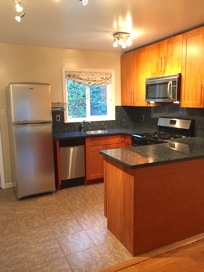 - Kitchen: Newer renovated! Stainless steel appliances, including built-in microwave, dishwasher and gas stove. Granite counter tops, and deep sink.