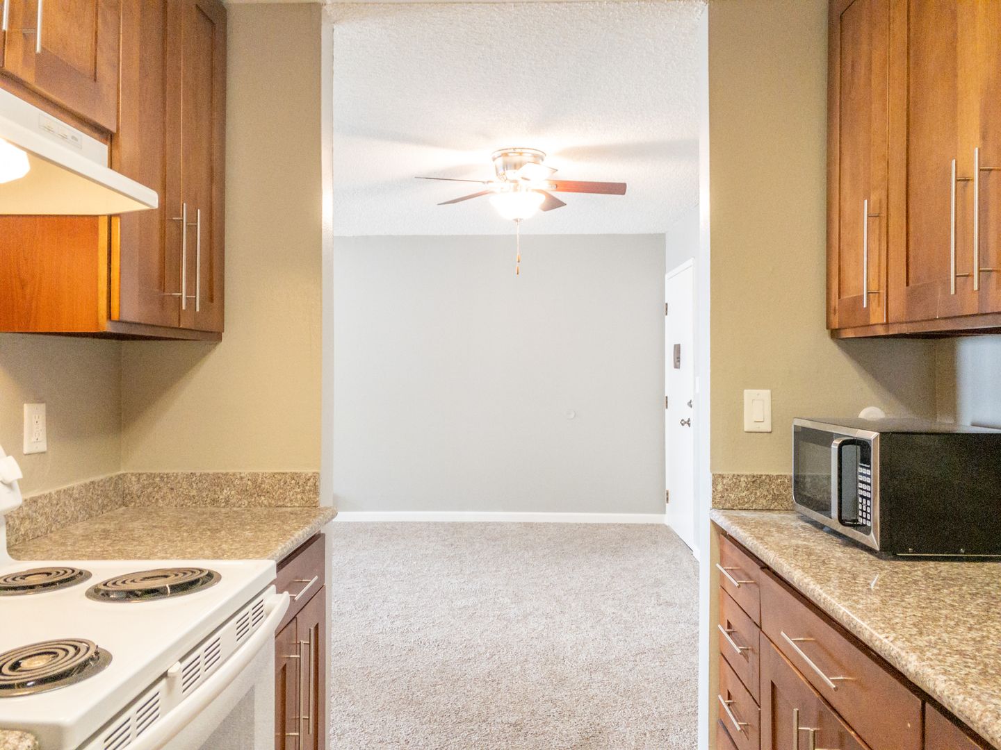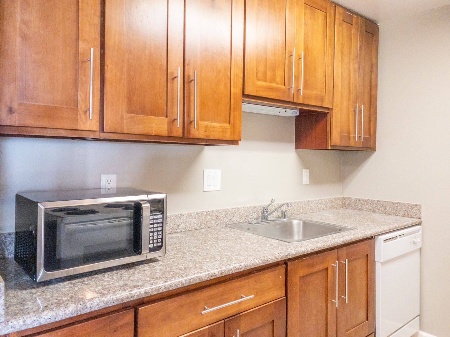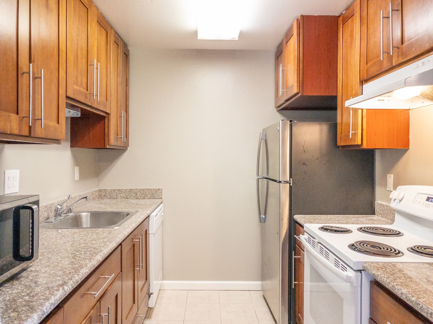 The updated kitchen features stove, refrigerator, dishwasher, ample cabinet space and granite countertops.